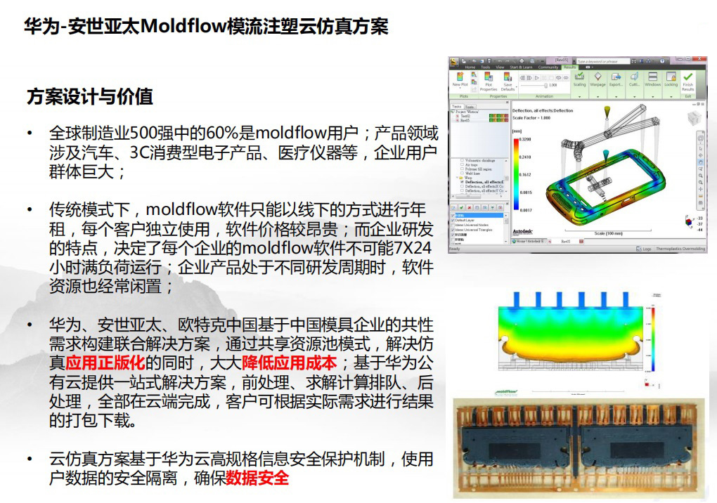 安世亞太工(gōng)業雲解決方案包含通(tōng)用機械行(xíng)業,電子元器件行(xíng)業,航空航天行(xíng)業,家電行(xíng)業,汽車行(xíng)業,能(néng)源行(xíng)業,醫(yī)療行(xíng)業等多個解決方案,仿真工(gōng)具包含了(le)結構場,流體場,電磁場,優化等多個領域通(tōng)用和(hé)專用工(gōng)具。能(néng)夠根據客戶或項目需求靈活定制仿真工(gōng)具方案。 模具定制包包含的軟件為(wèi)Moldflow模流注塑仿真軟件包,硬件資源包括華為(wèi)桌面雲,計算服務器,license管理器等。 Moldflow軟件介紹 Moldflow仿真軟件具有注塑成型仿真工(gōng)具,能(néng)夠幫助您驗證和(hé)優化塑料零件、注塑模具和(hé)注塑成型流程。該軟件能(néng)夠為(wèi)設計人(rén)員(yuán)、模具制作(zuò)人(rén)員(yuán)、工(gōng)程師(shī)提供指導,通(tōng)過仿真設置和(hé)結果闡明(míng)來展示壁厚、澆口位置、材料、幾何形狀變化如(rú)何影響可(kě)制造性。從(cóng)薄壁零件到厚壁、堅固的零件,AutodeskMoldflow的幾何圖形支持可(kě)以幫助用戶在最終設計決策前試驗假定方案。 方案設計與價值 •全球制造業500強中的60%是moldflow用戶;産品領域涉及汽車、3C消費(fèi)型電子産品、醫(yī)療儀器等,企業用戶群體巨大; •傳統模式下(xià),moldflow軟件隻能(néng)以線下(xià)的方式進行(xíng)年(nián)租,每個客戶獨立使用,軟件價格較昂貴;而企業研發的特點,決定了(le)每個企業的moldflow軟件不可(kě)能(néng)7X24小時(shí)滿負荷運行(xíng);企業産品處于不同研發周期時(shí),軟件資源也經常閑置; •華為(wèi)、安世亞太、歐特克中國(guó)基于中國(guó)模具企業的共性需求構建聯合解決方案,通(tōng)過共享資源池模式,解決仿真應用正版化的同時(shí),大大降低(dī)應用成本;基于華為(wèi)公有雲提供一(yī)站式解決方案,前處理、求解計算排隊、後處理,全部在雲端完成,客戶可(kě)根據實際需求進行(xíng)結果的打包下(xià)載。 •雲仿真方案基于華為(wèi)雲高規格信息安全保護機制,使用戶數(shù)據的安全隔離,确保數(shù)據安全 規格說明(míng) 規格計費(fèi)方式服務價格模流注塑仿真工(gōng)具-廣東上(shàng)雲上(shàng)平台按年(nián)100000元/年(nián)