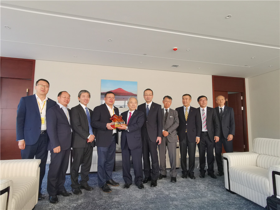 壹金(jīn)會綠(lǜ)色智造産業聯盟餘瑾會長(cháng)(左四)為(wèi)日本發那(nà)科株式會社稻葉善治會長(cháng)(左五)送上(shàng)開(kāi)業賀禮